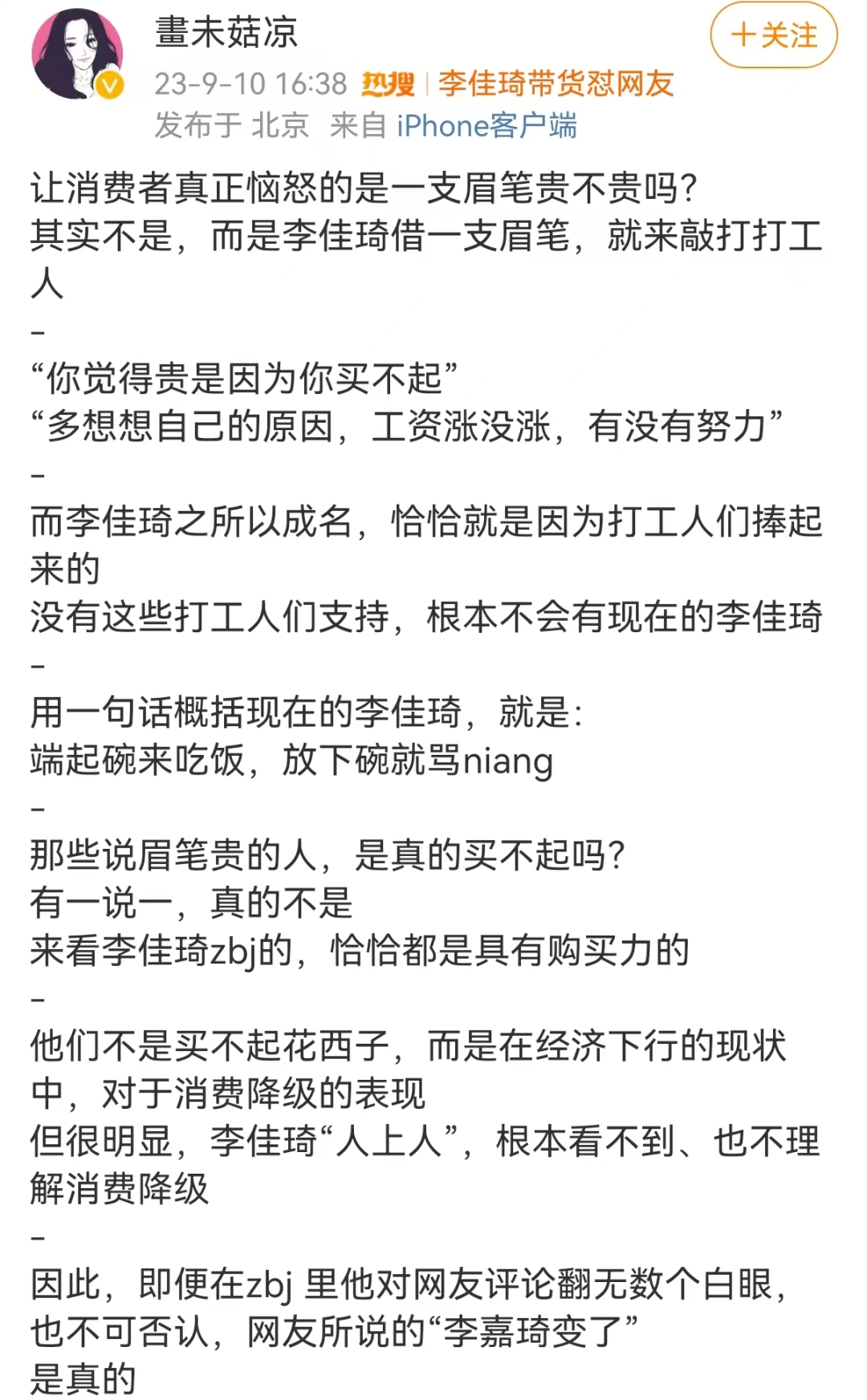 从内容看,这还是李佳琦直播时在为自己的PUA言论找补,可能是想通过“卖惨”来博得大家同情,却更加坐实了“何不食肉糜”、“变飘了”的嘴脸。