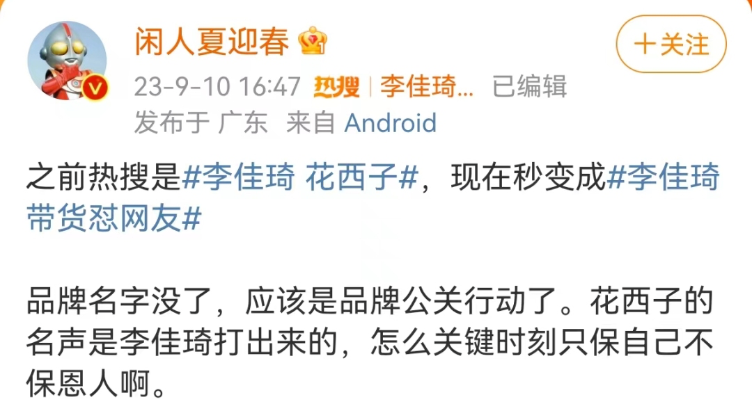 网友@闲人夏迎春吐槽,可能是花西子的公关团队介入想把品牌名隐藏,而指向李佳琦本人……“关键时刻只保自己不保恩人啊”。