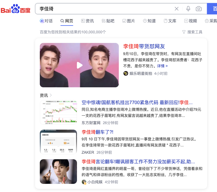 原因是他们发现,李佳琦怼网友的相关热搜,从9月10日下午15点37分登上微博热搜第一截至当晚22点30分,7个小时2个热门话题之下,微博和百度两大平台都没有重量级的媒体跟进。