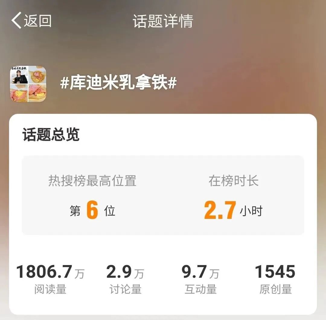 再看库迪,周一上新后,#库迪米乳拿铁#冲到了热搜榜第6位,在榜时常累计2.7小时,之后就不再有进一步发酵的话题讨论。