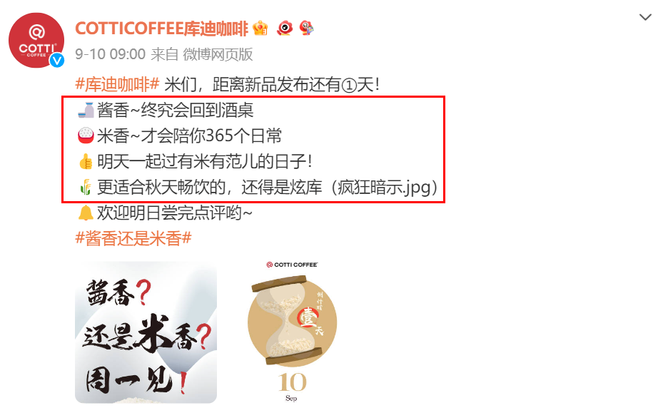 酱香还是米香?颇有甜粽还是咸粽、救老婆还是救老妈这样的经典二选一问答,要的就是“有我没你”。微博配文也非常有意思:酱香,终究会回到酒桌;米香,才会陪你365个日常;明天一起过有米有范儿的日子;更适合秋天畅饮的,还得是炫库!