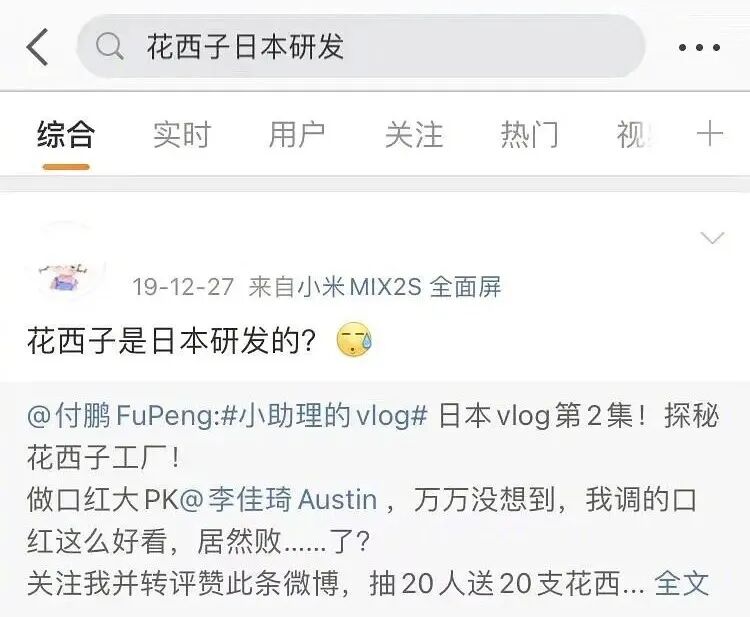 或是被扒国货标签存疑,因为有网友发现在李佳琦团队19年拍摄的VLOG中,它家研发中心是在日本:“花西子请不要标榜自己是国货,靠着李佳琦扶持国货这股风,赚得盆满钵满,最后背刺的还是普通人。”