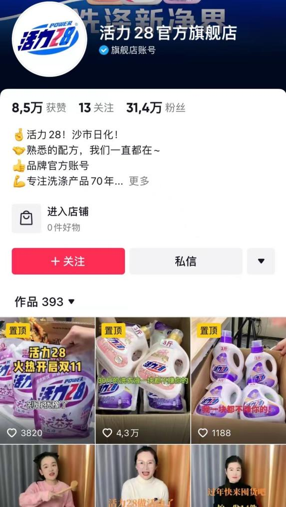 而背后主体是“成都意中洗涤用品有限公司”的抖音账号,却在“三个小老头”的加持下,将活力28送上热搜。