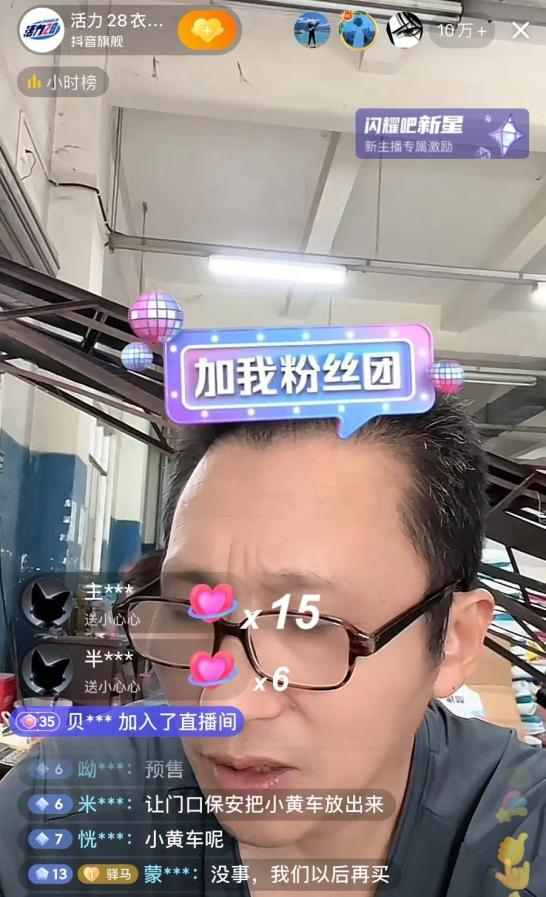 5天,抖音账号“活力28衣物旗舰店”涨粉超过300万,直播11场,场均在线人数峰值10万,直播销售额在1000万到2500万元区间。