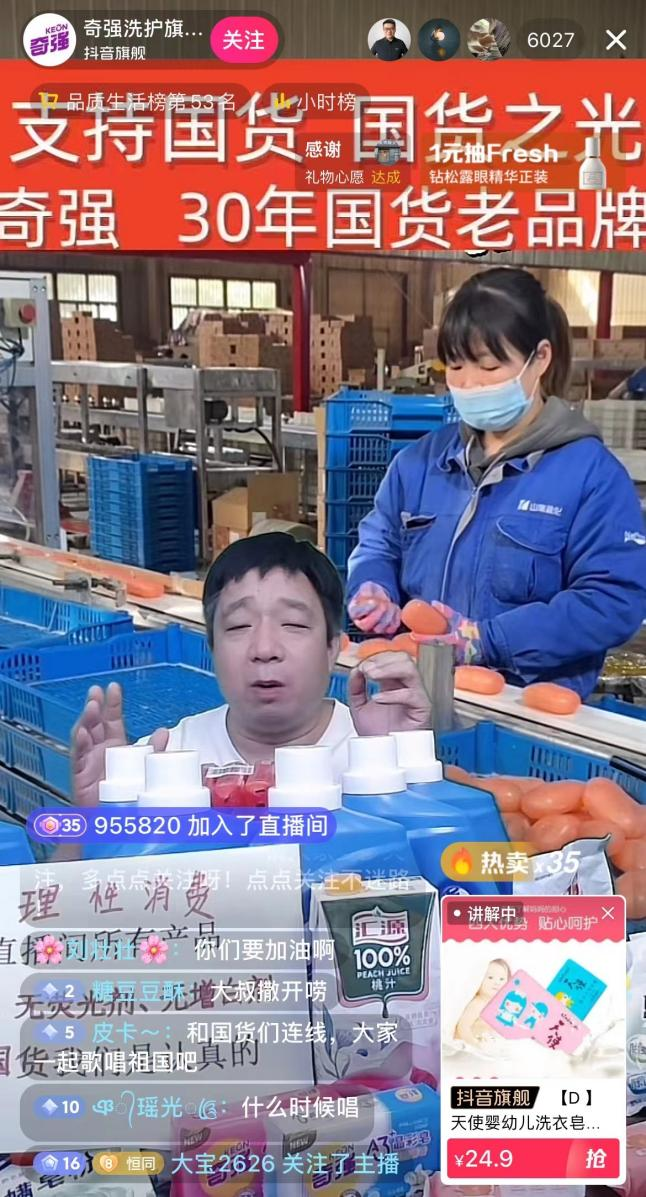 一些人在评论区留言“奇强老板都哭了,大家都去支持支持吧”。这一天的晚上,奇强董事长在抖音直播间“营业”,观看人数突然从50人陡增到几千人的时候,他激动得哭了。被感动的网友跑去别的直播间“摇人”,评论区开始出现“我是从活力28那里来的”。其后,提到早些时候的落泪,董事长再次哽咽,随后低下头擦眼泪。