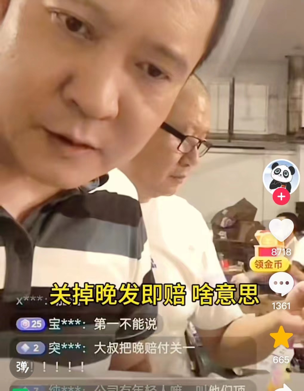 一开始,粉丝让他们叫“宝宝”,大叔们叫不出口,就唤“孩儿们”;粉丝提醒他们关掉“晚发赔付”,担心他们发货跟不上会被罚款,大叔们面面相觑,根本听不懂是什么意思;大叔们没有直播间“违禁词”的概念,总是说错话、直播间被封,在粉丝的建议下准备了一张写着“自助下单”的纸,却不懂怎么关闭镜像效果,只能将纸反过来展示。