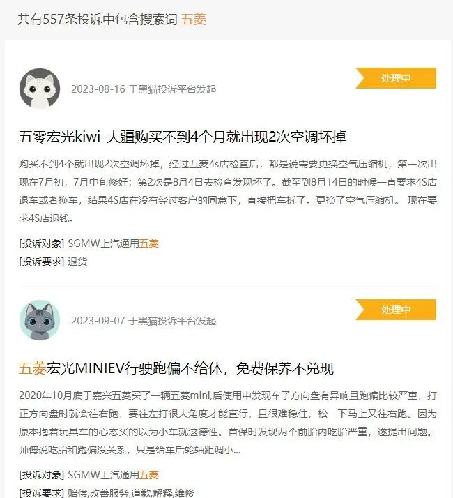 9月14日,极派Daily在黑猫投诉平台上搜索“五菱”,出现了557条投诉,车型涉及宏光MINIEV、五菱缤果、宝骏等,而登登反映的问题也在黑猫投诉平台上多次被提及。