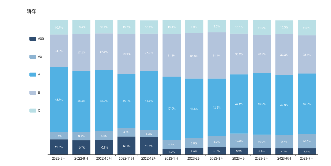 另外,整个A00级汽车市场的销量也在大幅萎缩。电车人数据显示,今年7月,A00级新能源乘用车销量同比下降41%,乘联会数据也显示,在轿车整体销量中,A00的销量占比已经从去年的11.3%降低至今年7月的4.7%。