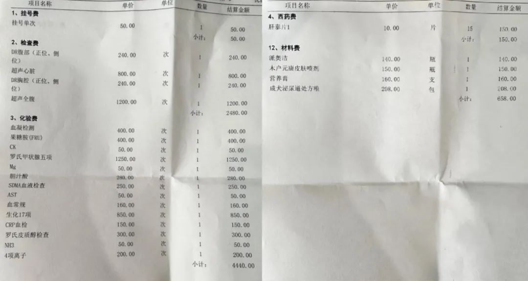 “我生病花了80痊愈了,它体检就花了8000。”上海的网友七七有一只9岁的宠物狗,今年年初做了全面体检,挂号费加上检查费花了2530元,检查包括腹部DR、胸腔DR、超声心脏、超声全腹这4种项目。