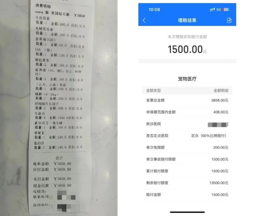 “第一次去医院治疗我全额付的医药费,后来朋友建议我买个保险,要不然看大病太贵了,我买了单次最高1500元赔付的医疗险,后来我家猫又去看了一次,账单显示第二次手术费是3858元,之后我在平台申请理赔,提供了身份证、手术协议和发票之类的资料,第二天就通过了,因为定点医院报销60%,除去不能赔付的项目,一共赔付我1500元。”