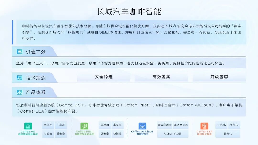 目前,长城汽车已经衍生出咖啡智能座舱系统(Coffee OS)、咖啡智能驾驶系统(Coffee Pilot)、咖啡智能云(Coffee AI Cloud)、咖啡电子架构(Coffee EEA)等全域范畴的智能化产品。