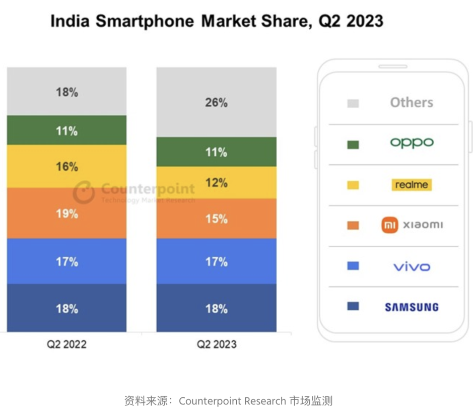 连番调查带来的直接影响,则是有望打断vivo在印度的增长势头。2023年第二季度,vivo以17%的市场份额,跻身印度智能手机出货量第二,仅次于三星,且是印度TOP5中唯一实现同比增长的手机厂商。