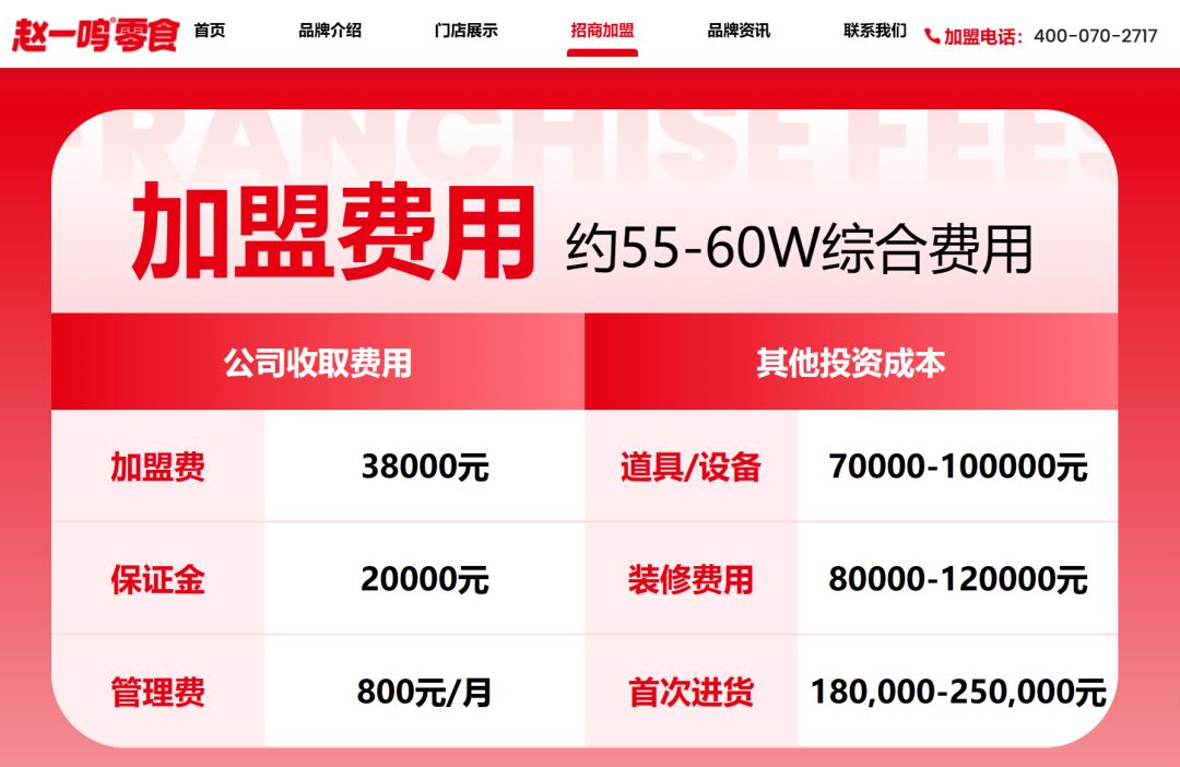 “虽然看上去不高,但后续有许多其他的费用。”李伟说,不少加盟品牌对加盟店的首次拿货量有规定,比如“赵一鸣”就规定了,首次进货价格至少为18万元。