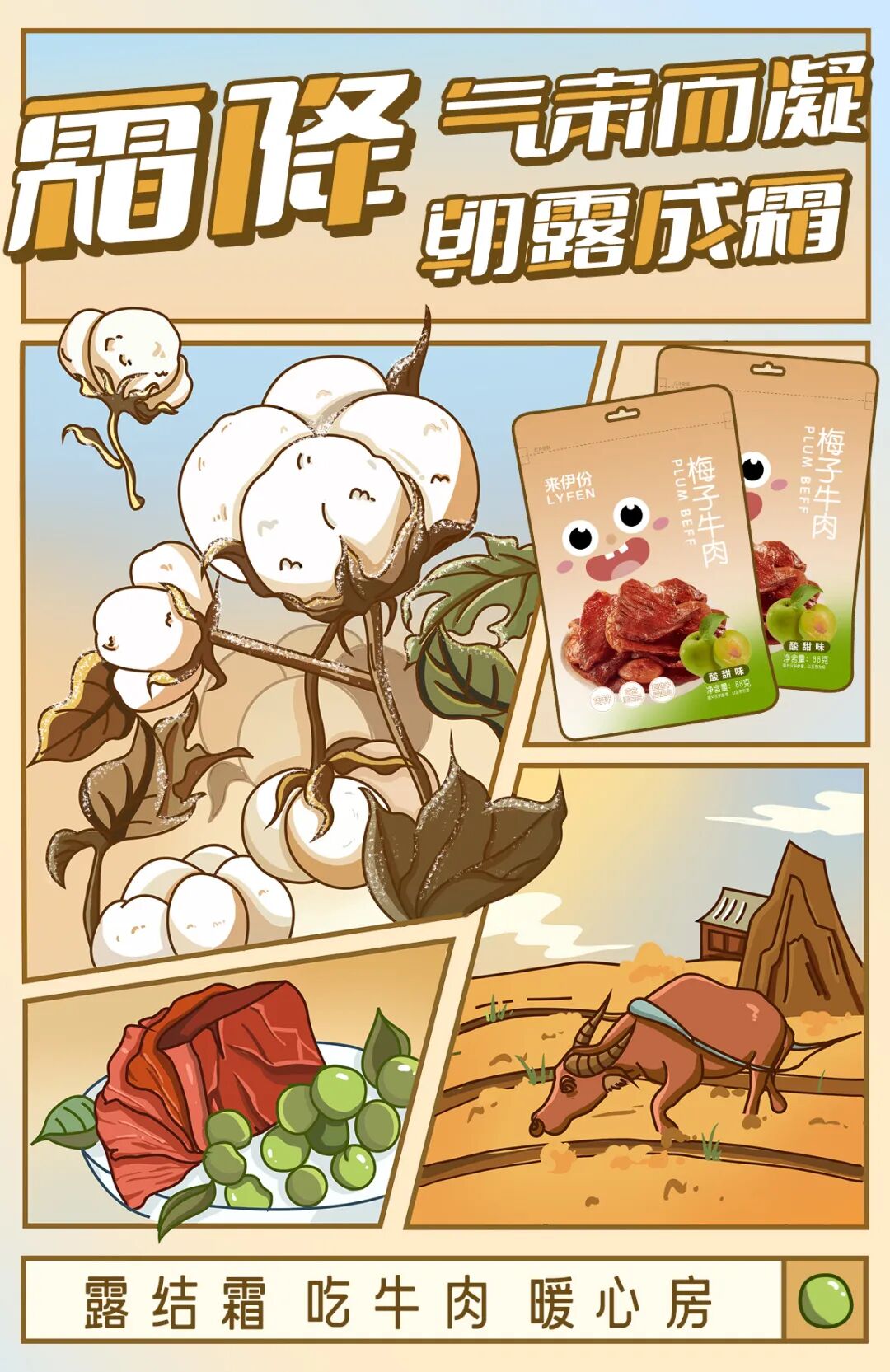 霜降,秋天的最后一个节气,天气开始变冷赶快裹紧我的小棉被,手捧一包梅子牛肉,享受酸甜鲜香的营养高蛋白!别提有多爽啦~