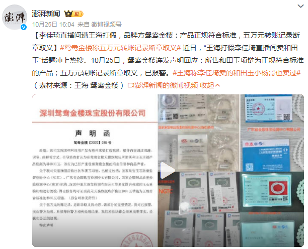 事件曝光后,深圳鸳鸯金楼珠宝发布了声明函,坚称出售的和田玉项链是正规符合标准的,并有相关检测报告可作为证明。而美ONE则表示,以品牌方回应为准,态度模棱两可。其实,除了选品,双11期间关于李佳琦的瓜一个接一个。比如被京东采购炮轰的“二选一”问题,直接掀起了关于“全网最低价”的大讨论;预售付尾款期间,#李佳琦直播间疑为冲销量未付先送#又冲上热搜,多位消费者反映在李佳琦直播间付了定金但还没付尾款,却已经收到货,怀疑商家是为了冲销量才这么干的。