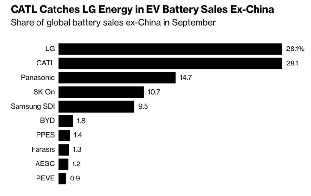 据SNE Research数据显示,2023年前三季度,宁德时代的市场份额为36.8%;比亚迪的市场份额为15.8%、LG新能源的市场额为14.3%;在不含中国的海外市场,宁德时代和LG 新能源的市场占有率首次持平,均为28.1%。