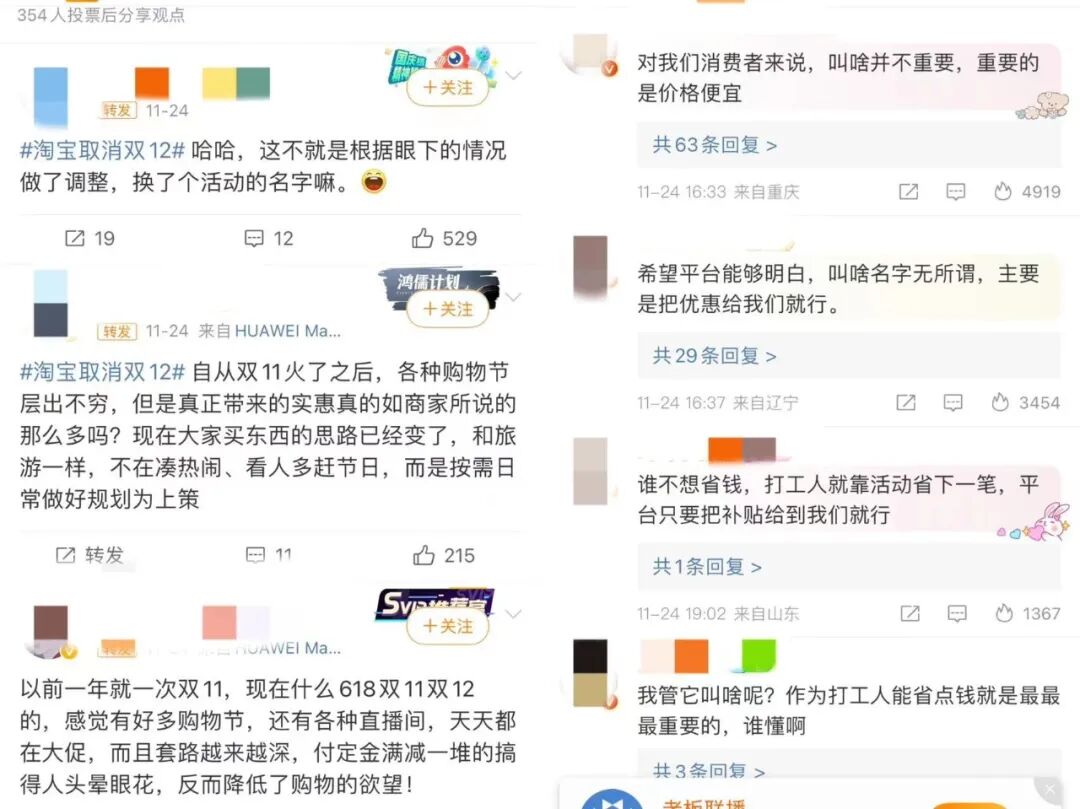 淘宝取消今年双12活动的消息流出后,网友们的态度几乎如出一辙。“反正对我来说,买东西有便宜就行,随便它叫年终好价节还是双12”“希望平台能够明白,叫啥名字无所谓,主要是把优惠给我们就行”“我们的关注点永远是价格价格价格,买到便宜才是重点”……简单来说,只要实惠是真的,那么无论新的节日叫什么名字,都会有人买账。