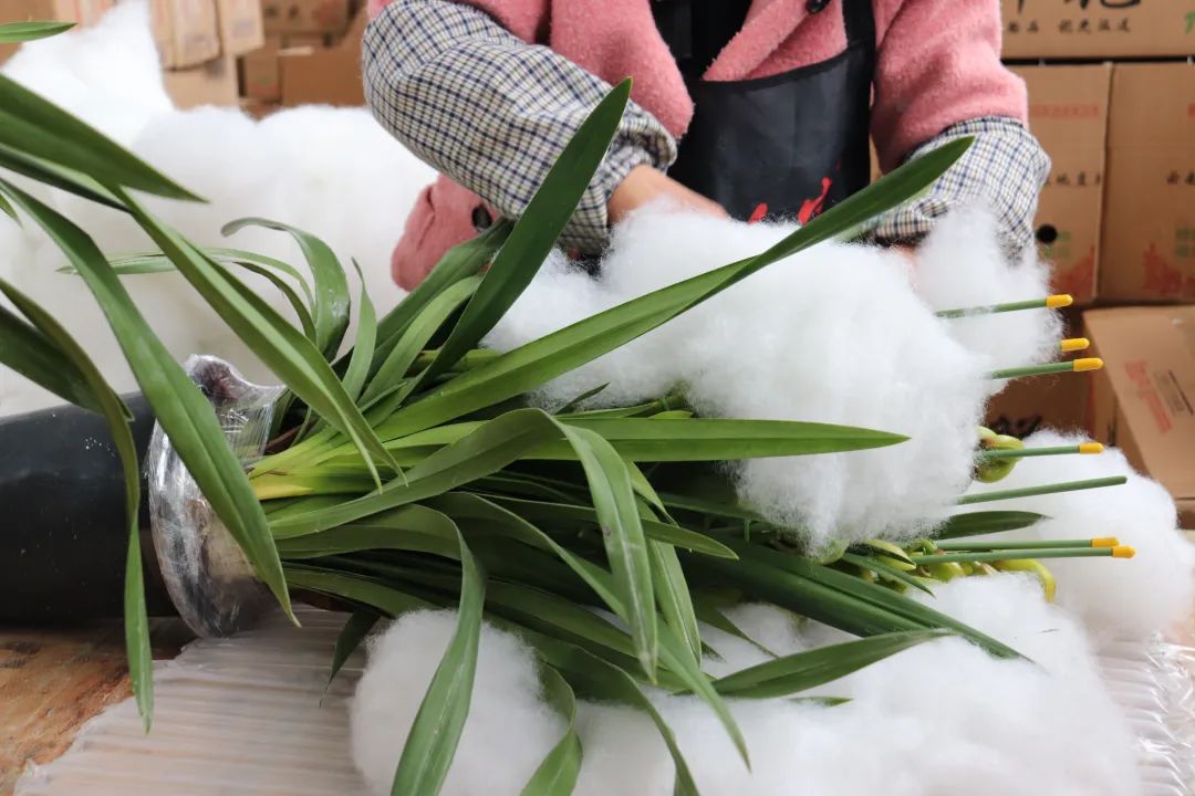 同时,英茂公司还改良了大花蕙兰的产品包装和打包方式,不仅定制了更抗摔的树脂盆器,还使用了物流行业最高规格的加厚瓦楞纸。并且在打包时,会为花茎裹上气泡柱,再加装防撞棉。