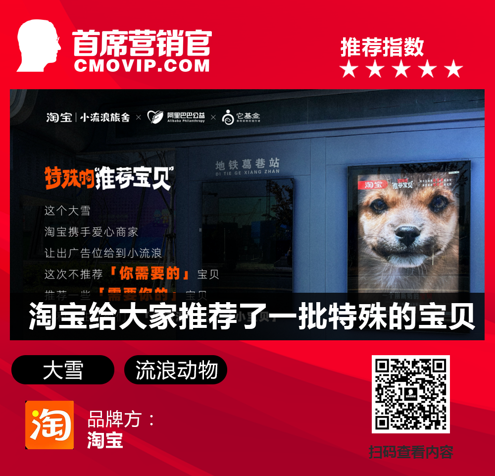 大雪这天,淘宝联动55个爱心宠物品牌们,让出了店铺里珍贵的「推荐宝贝」广告位,换上一批「特殊的推荐宝贝」,向大家推荐“需要你”的宝贝。