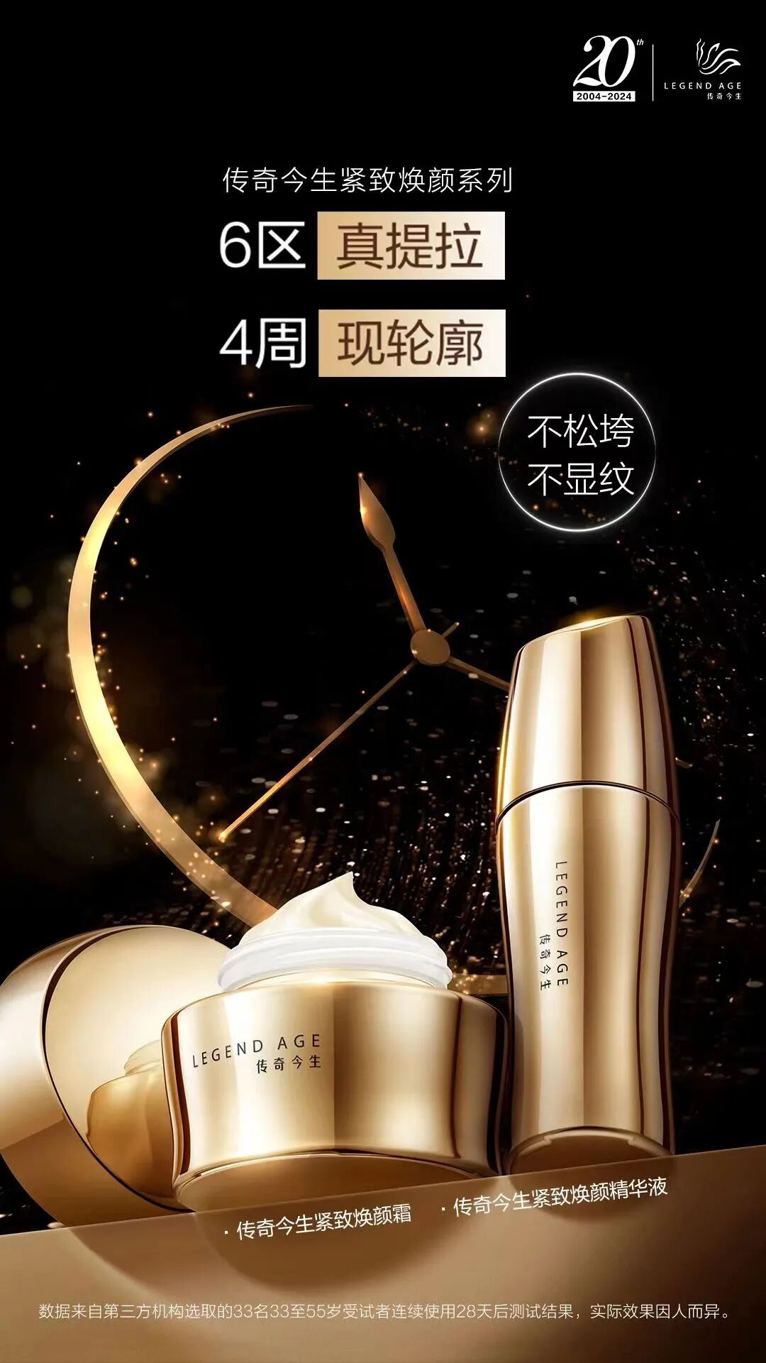 这场庆典可谓星光熠熠,打造了“20周年巨型蛋糕”、“奥斯卡空间”,“荣耀之光”、“时光隧道+星光大道”、“20周年艺术造型”、“玫瑰之吻”等6大绝美拍照打卡区,并发布新品紧致焕颜系列,探索逆龄奇肌,再次开启凝驻时光的魔力之旅!正如20周年主题“我们正青春”,传奇今生再次用匠心守护肌肤保持青春的秘密。这一次的新品发布,是传奇今生沉淀20年之久的行业实力累积。6区真提拉、4周现轮廓,传奇今生让逆龄效果真实、具体、可视化:传奇今生紧致焕颜系列通过了国家认可检测机构第三方实测,并获得了所有受试者们100%满意的结果。传奇今生用实力证明了中国制造的实力与魅力,也让国货美妆品牌未来的发展,看见了无限可能!