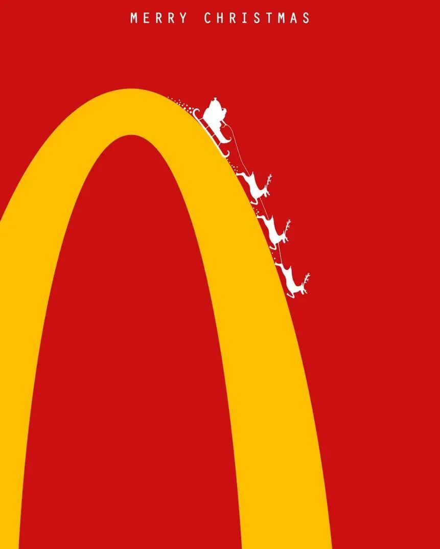 麦当劳圣诞海报基于红黄的色调,采用了logo拆分形式和适当留白的排版方式。将圣诞元素融入品牌符号中,半边金拱门上的三只麋鹿拉车向下冲刺,极具创意。