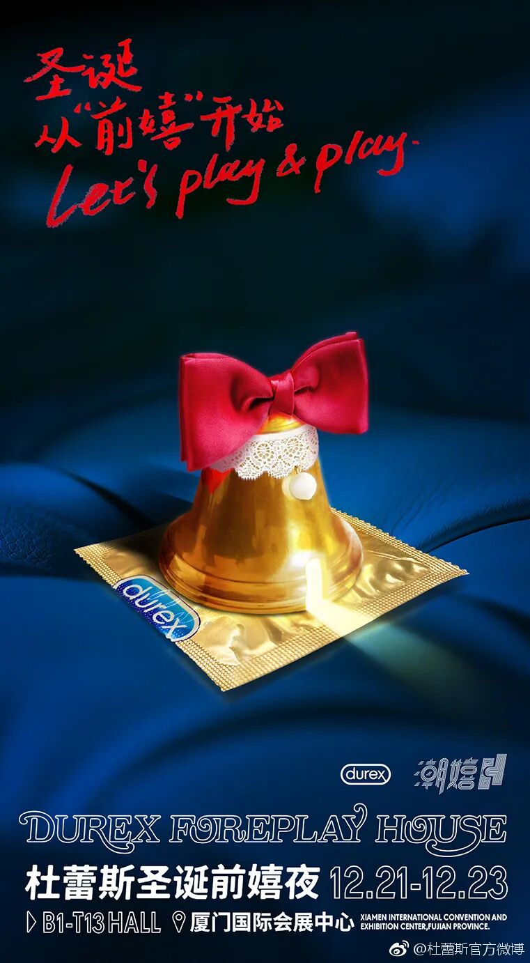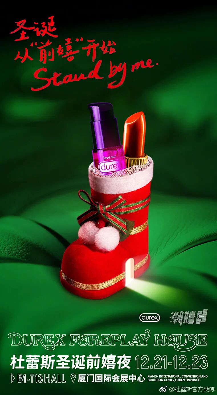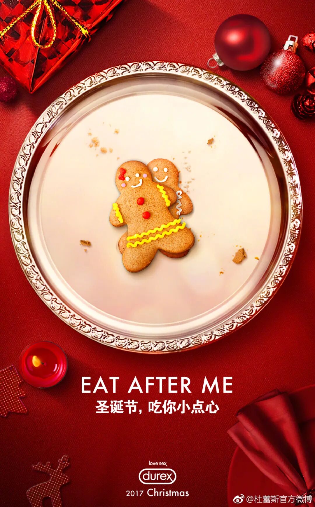 杜蕾斯海报,大都采用圣诞节的象征色红+绿,结合产品本身和圣诞元素(圣诞靴、装饰球、铃铛、姜饼人),搭配老司机的谐音文案,情调和氛围瞬间拉满。