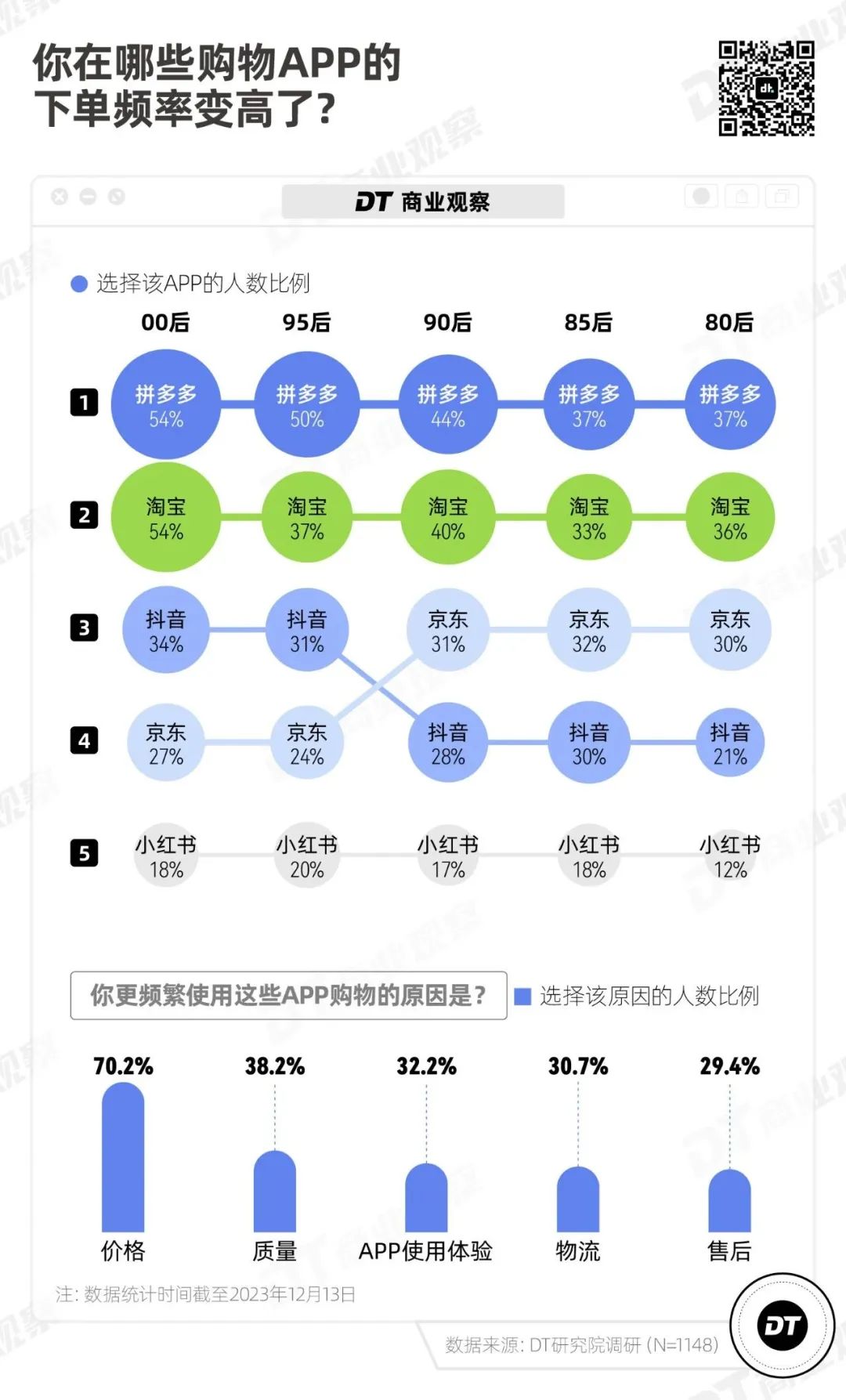在公司层面,拼多多市值一度超过阿里;在消费者层面,拼多多在80后到00后全年龄段中,都排在了“下单频率更高的APP”的第一位,且在00后(54%)和95后(50%)当中最为明显。