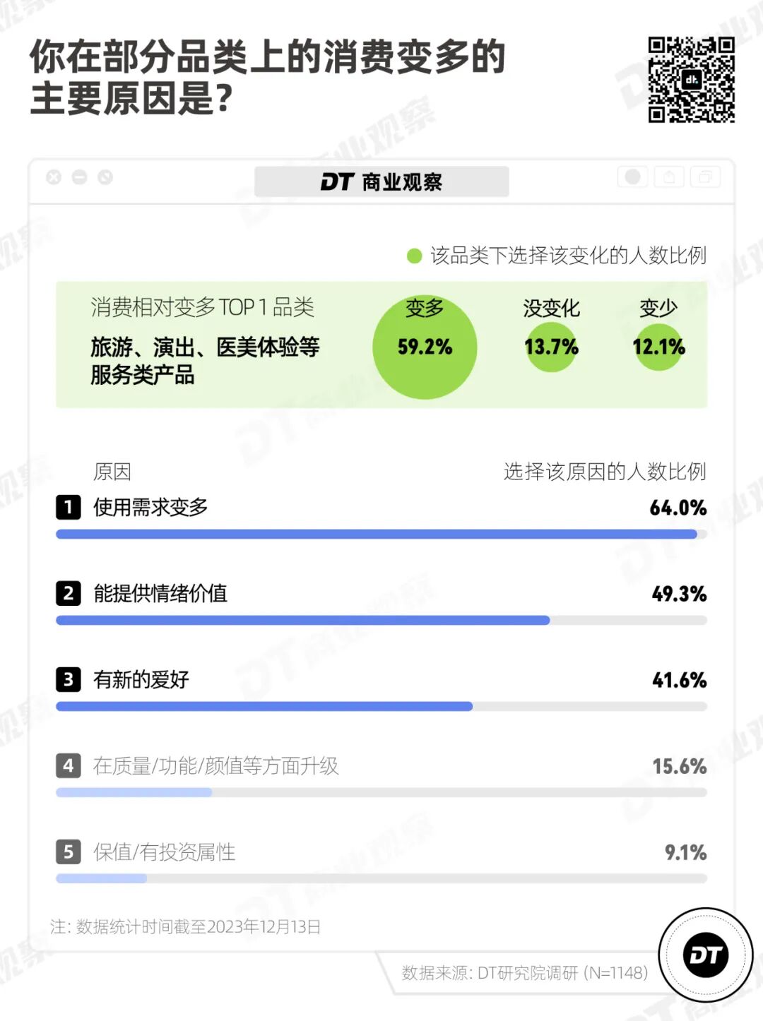 最明显的是,在旅游、演出、医美体验等服务类产品上,开支变多。