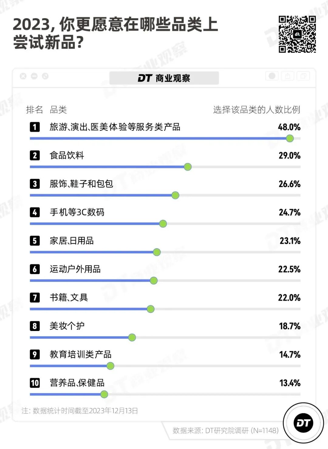 在人们乐意尝新的品类中:仍然是服务类产品排在第一,其次是食品饮料,再之后才是服饰、鞋子和包包,美妆个护只排第八。