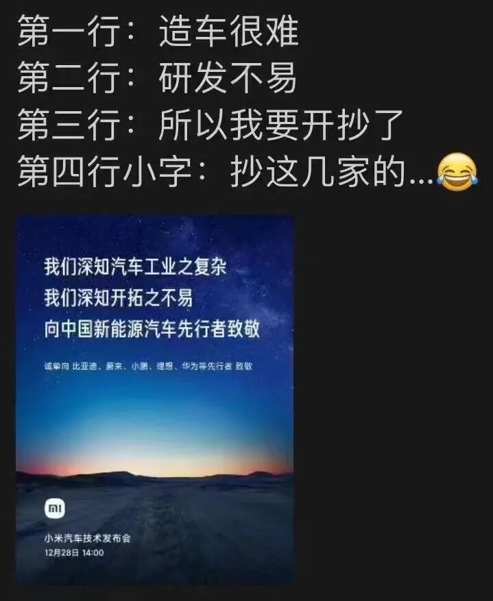 其中最为犀利的评价莫过于一张流传甚广的“潜台词”海报,造车很难、研发不易等几句话调侃小米汽车的“致敬文学”的深层含义。