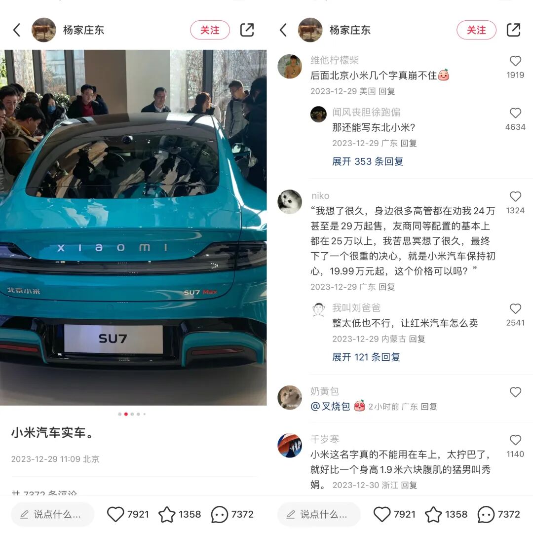 在网友最为关注的价格方面,众所周知,小米的底色曾是性价比、薄利多销和价格杀手。从“年轻人的第一台手机”到“年轻人的第一台电视”再到“年轻人的第一台两轮平衡车”,低价打法深入人心。因此对于小米汽车的定价,“9.9万元交个朋友”是众多网友的期许。
