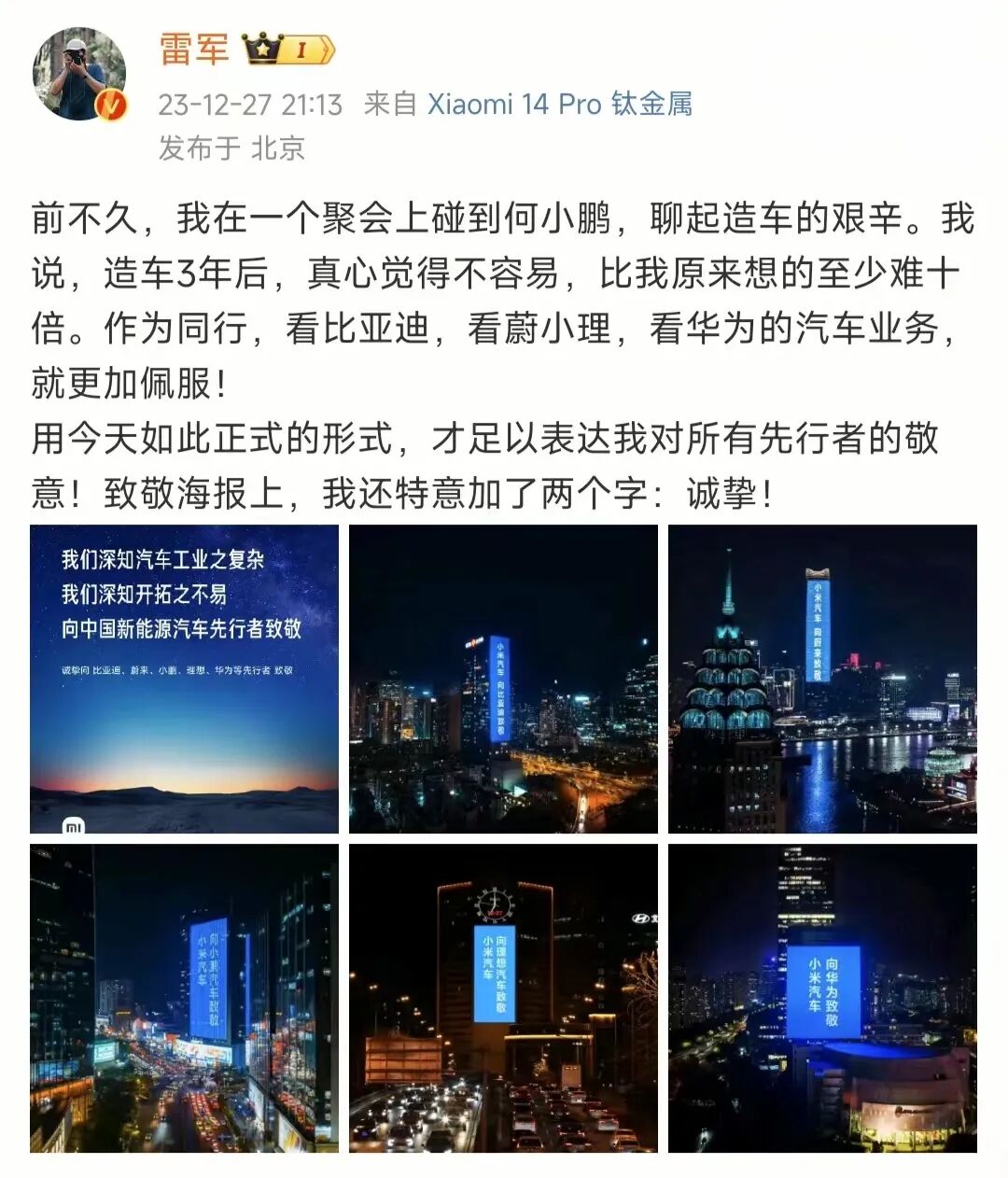 当天晚间,北京、上海、深圳、广州四地同一时间出现楼体巨幅广告,小米在各车企所在城市点亮地标性楼体,向同行致敬。这一“致敬文学”营销举措,瞬间在全网吸引了极大的关注度,网友对此举褒贬不一。