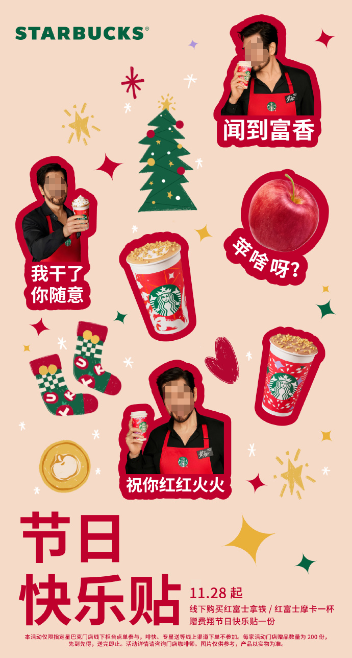 周边赠品是精髓,自然不能少。到店购买任意一杯可领取一张费翔老师的贴纸,若正价购买单杯新品还可获赠圣诞苹果主题袜一对。节日氛围拉满了,话题声量和产品销量也赚足了。