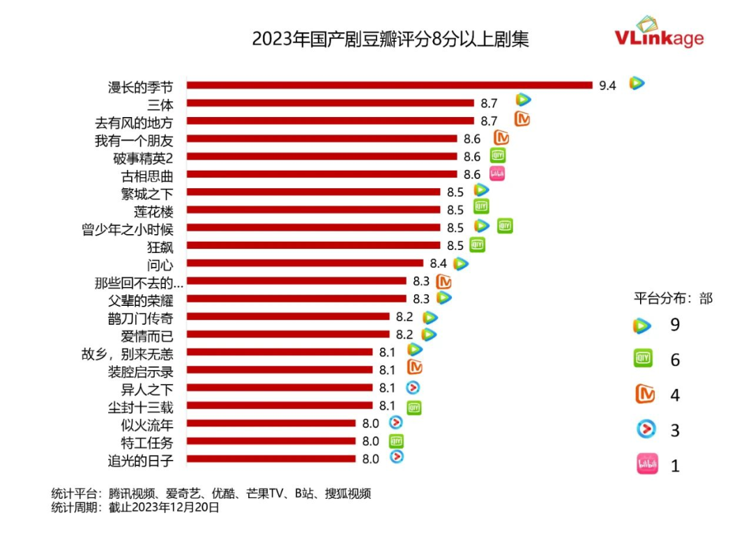 其中,腾讯视频在高质量内容的供应表现上格外典型,实现了口碑平均线与口碑上限的双重拉升。艺恩数据显示,腾讯视频上线的头部独播剧(播映指数TOP50)数量最多,且上线独播剧的好评度优于其他平台。同时在豆瓣评分8分以上的国产剧中,腾讯视频贡献数量最多,共有九部,其中《漫长的季节》更是以9.4的高分刷新国产剧近五年豆瓣评分纪录。