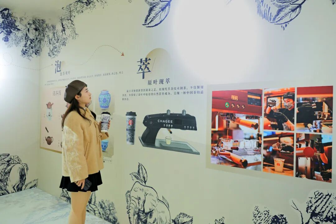 为了更生动地展现中国茶的历史变迁以及最新的样貌,霸王茶姬不仅把新一代的出茶、制茶设备搬进福建博物院,让自己变成展览的一部分,还在现场安排上了“现代茶空间”,让茶科技和茶文化变得触手可及。