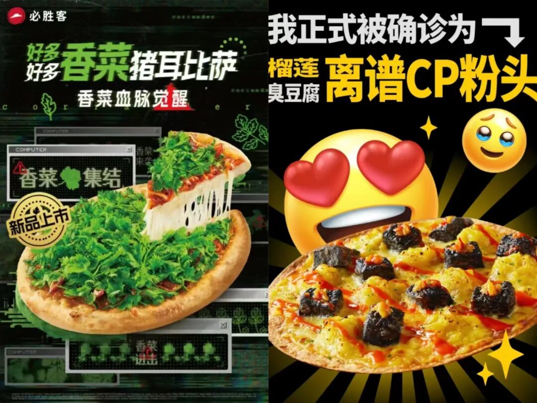 当然,咱大陆地区的必胜客也是个狠角色,23年先后推出了两款“有味道”的新品:榴莲臭豆腐披萨和香菜猪耳披萨。网红要素拉满,挑战了大众口味,也拿捏了互联网话题。