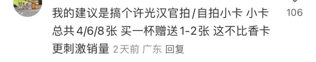 首先,许光汉有着不错的路人缘,毕竟谁不喜欢帅哥呢?再说了,春天到了,万物复苏,又到了让人浮想联翩的季节(不是),这不仅是杯奶茶,更是一副春天的心理“药剂”啊!但与此同时,我也开始隐约担心,这联名除了印制的签名就没有许光汉其他元素了,怎么刺激粉丝购买啊,毕竟韭菜也是会成长的。确实,再玩大一点,就弄个108款,然后设置常规款和隐藏款,这集卡欲不就来了?