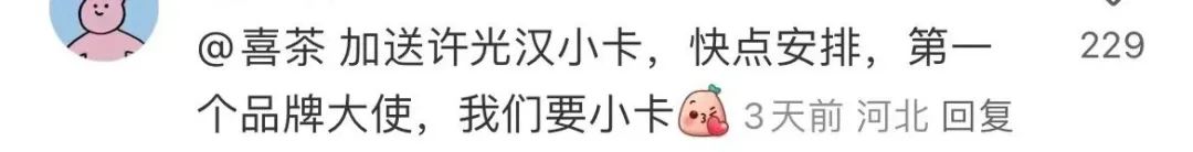 网友一语直接道破本质——这联名就不该和许光汉合作啊!这联名总有种似曾相识但又具体说不上来的节奏,原来是《上春山》……而且,照《上春山》前几天的高话题度和人们对春山学的挖掘只有15%的探索激情来看,如果喜茶是和《上春山》联名,则会开辟春山学新的巅峰。然后再找魏晨和魏大勋合作,精选君光想想就觉得刺激。在周边方面,可以送点什么非遗扇子,弘扬一下传统文化。要是再刺激点,就把艺人表演或访谈时的各种奇怪表情做成表情包贴纸,还有访谈梗,也可以一起放上去。