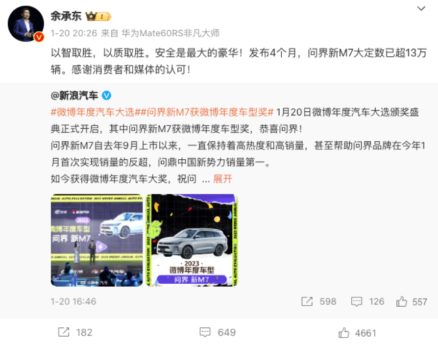 2023年下半年,问界的市场声量持续下行,平均月销量仅为5000辆左右。2023年9月,随着问界新M7问世,问界品牌迎来强势增长。官方资料显示,问界新M7上市四个月,订单量破13万台,智驾版占比60%。