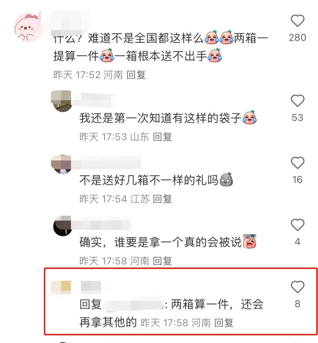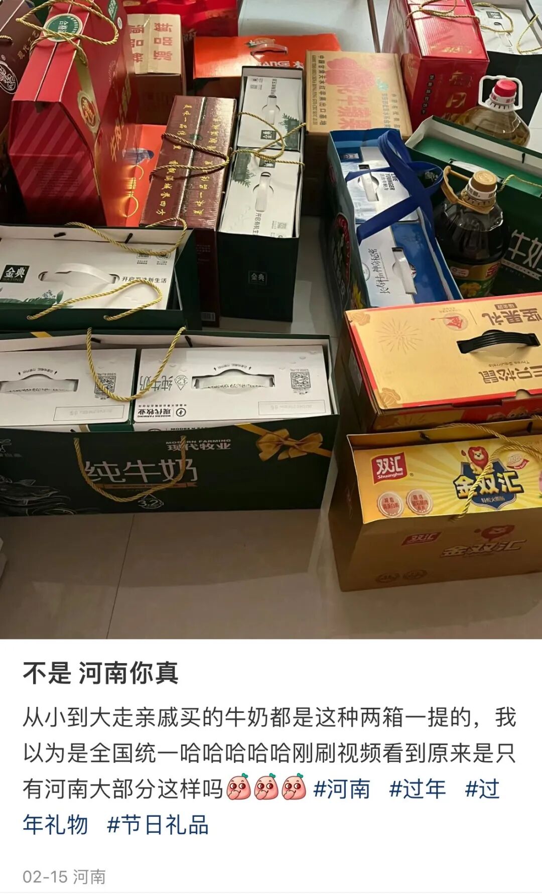 送一提两箱,主人只会觉得理所当然,因为全省人都是如此。送一提一箱,则会显得客人小气抠门,因为只有你格格不入。最终,河南人才是被play的一环,过年送礼成本变相提高了,而其中的巨额利润,都被商家赚走了。03