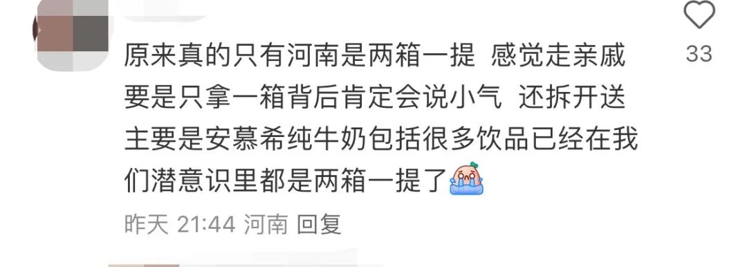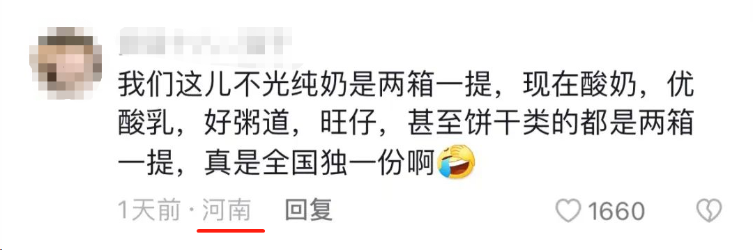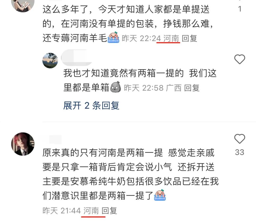 在相关评论区,我们会看到,所有河南ip的网友口径整齐划一,纷纷表示,自己从来没有见过一提一箱的包装,自从有特仑苏、金典、安慕希等产品,就是两箱一提。