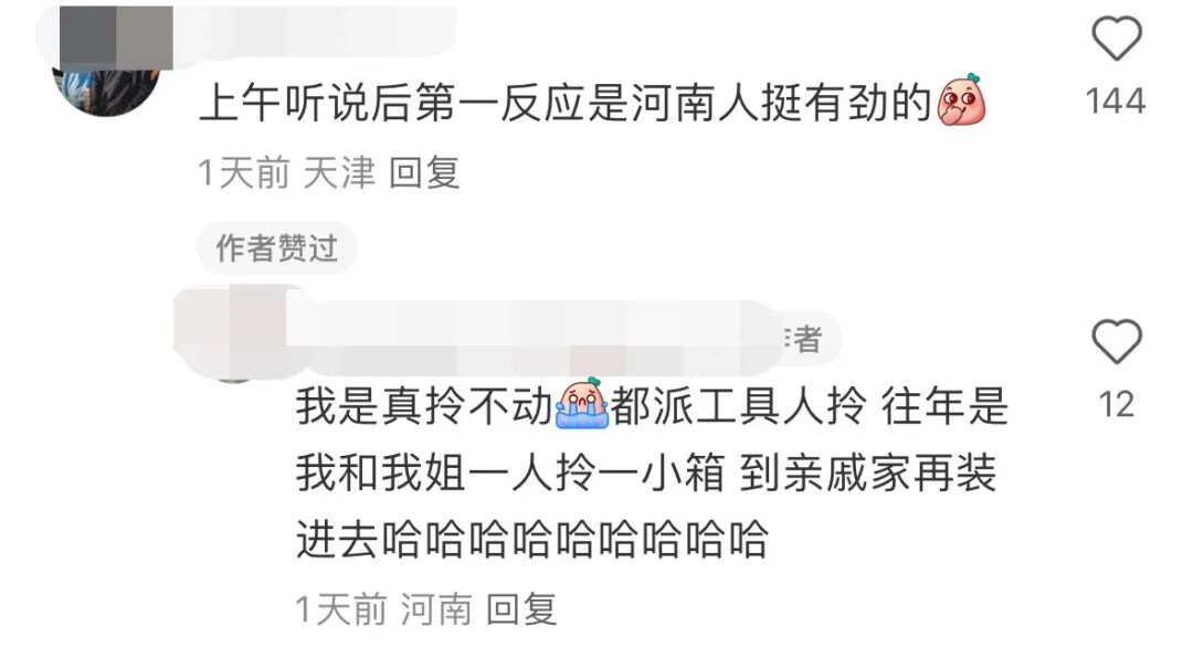 还有网友得出结论,看来河南人力气真的很大,可以提得动这么重的礼。但河南人表示,拎不动,全是硬撑罢了。