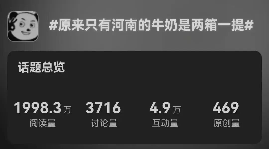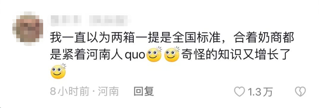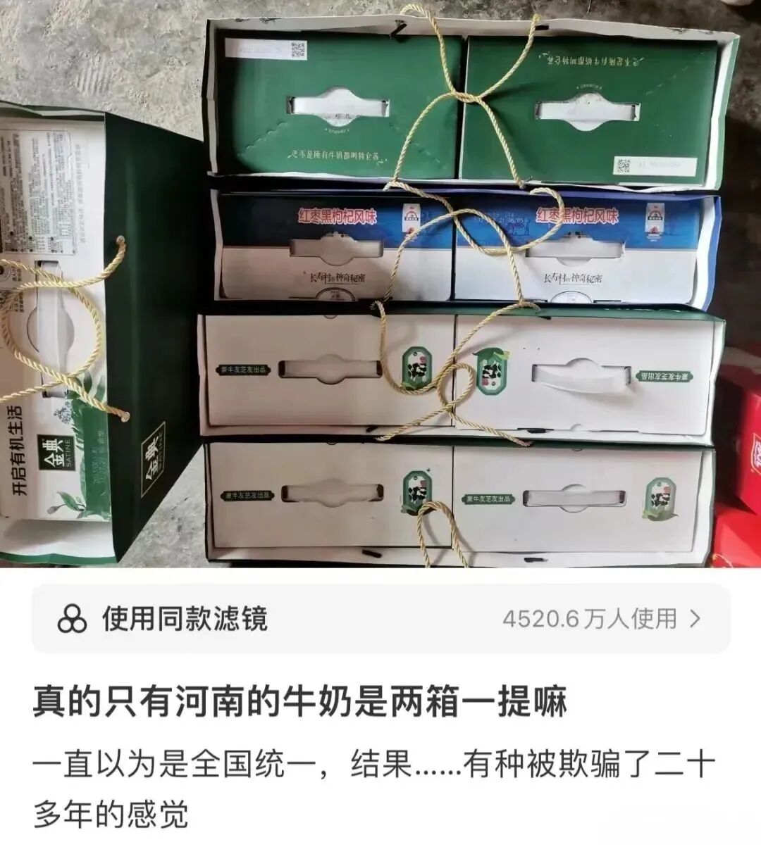 目前已经无从考证,到底是谁发现了这个惊天大秘密,但是,当话题#原来只有河南的牛奶是两箱一提#冲上热搜,在全网引发热议,河南人发现,全省人当大冤种当了这么多年。