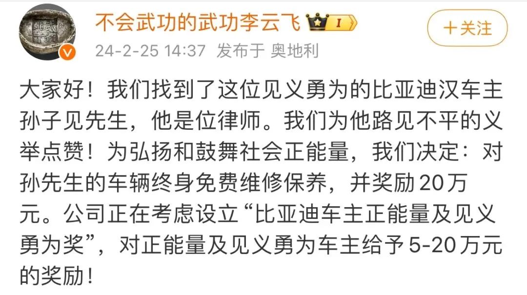 由于在杭州一条高架快速路上,某比亚迪车主见义勇为的事迹,比亚迪拿出了20万给该车主奖励,引发了诸多网友点赞。