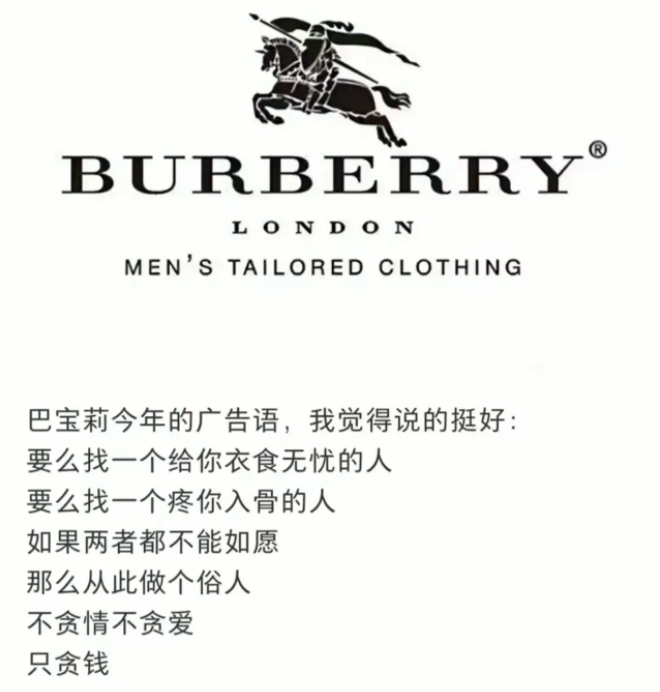 Burberry,“要么找一个让你衣食无忧的人,要么找一个疼你入骨的人”。