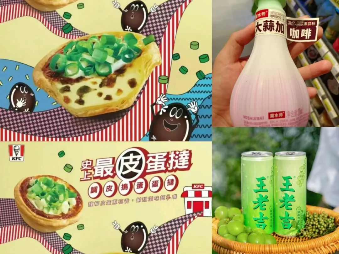 这也是各大品牌最常见的手段—在食品口味上做文章,将两种听起来毫不相关的食物放在一起,推出独特新颖的产品,以满足消费者对新鲜感和独特体验的需求。例如之前肯德基推出的“葱花皮蛋蛋挞”;魔水师的“大蒜咖啡”。藤椒味的王老吉、藿香味小雪糕、红花油汽水...