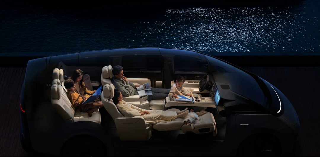 在图1中,坐在主驾驶位置上的小女孩歪曲着身体在小桌板上画画,而后排大人可以伸直腿在后排看书,官方在介绍时,也点明理想MEGA可以当作整个大家庭的书房。