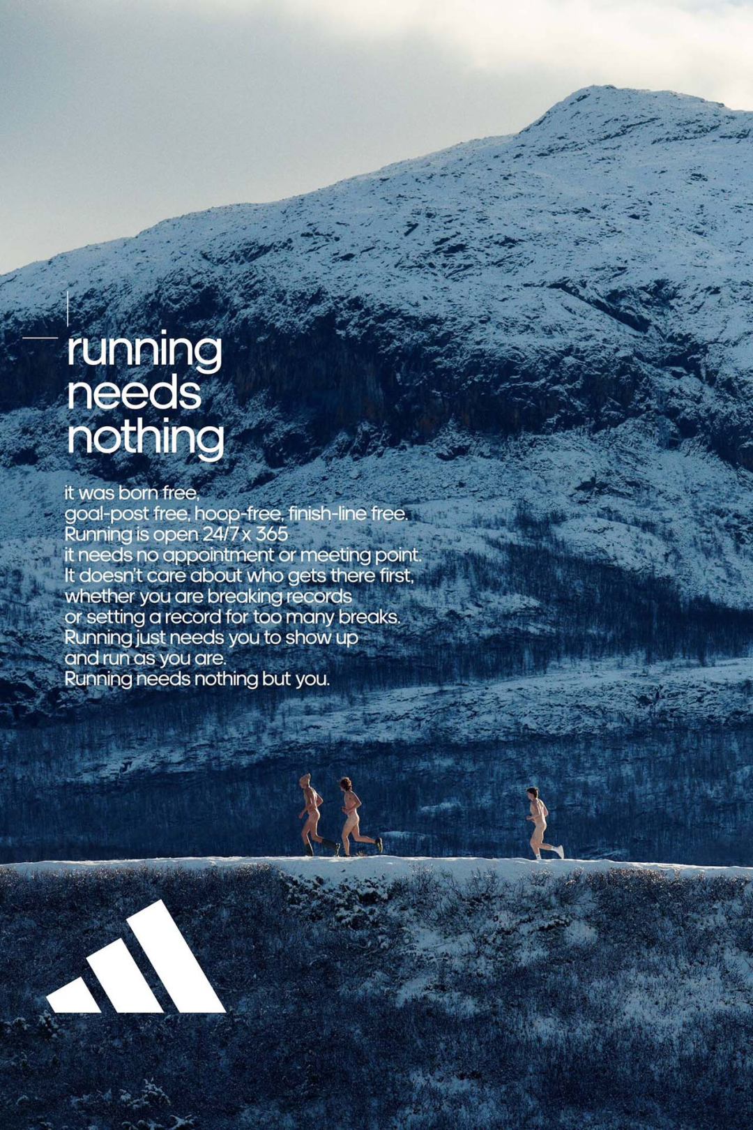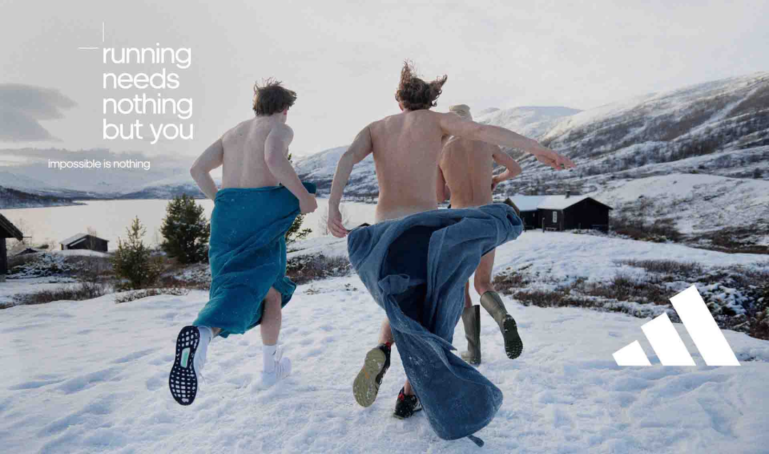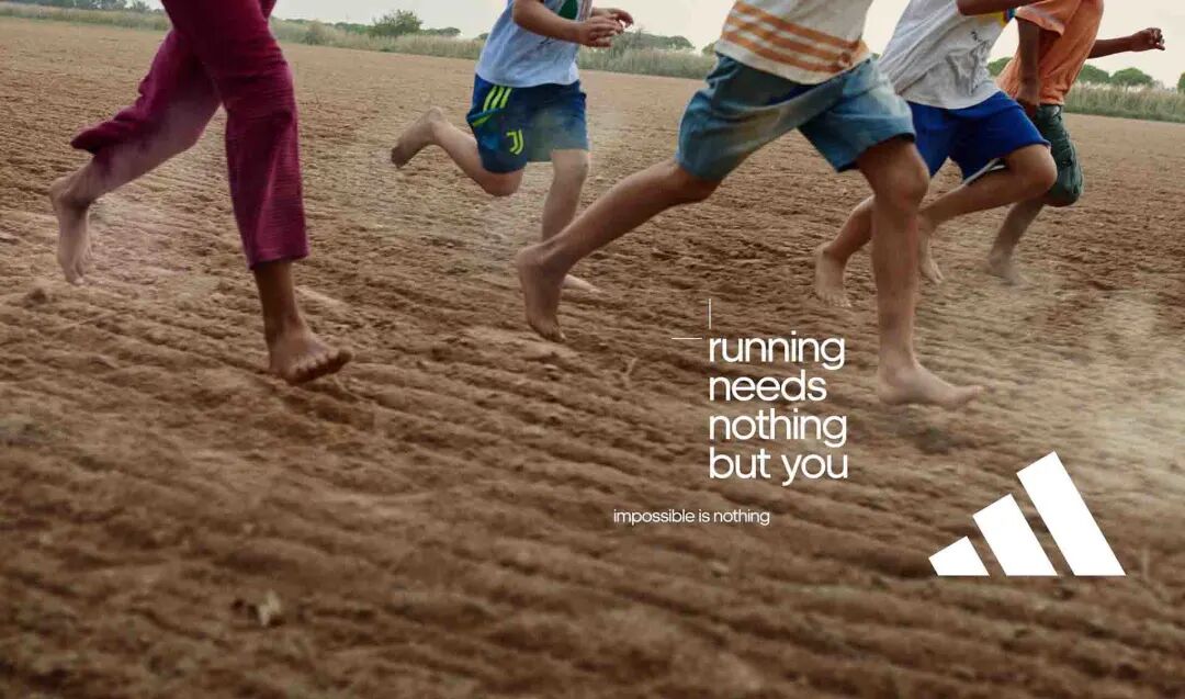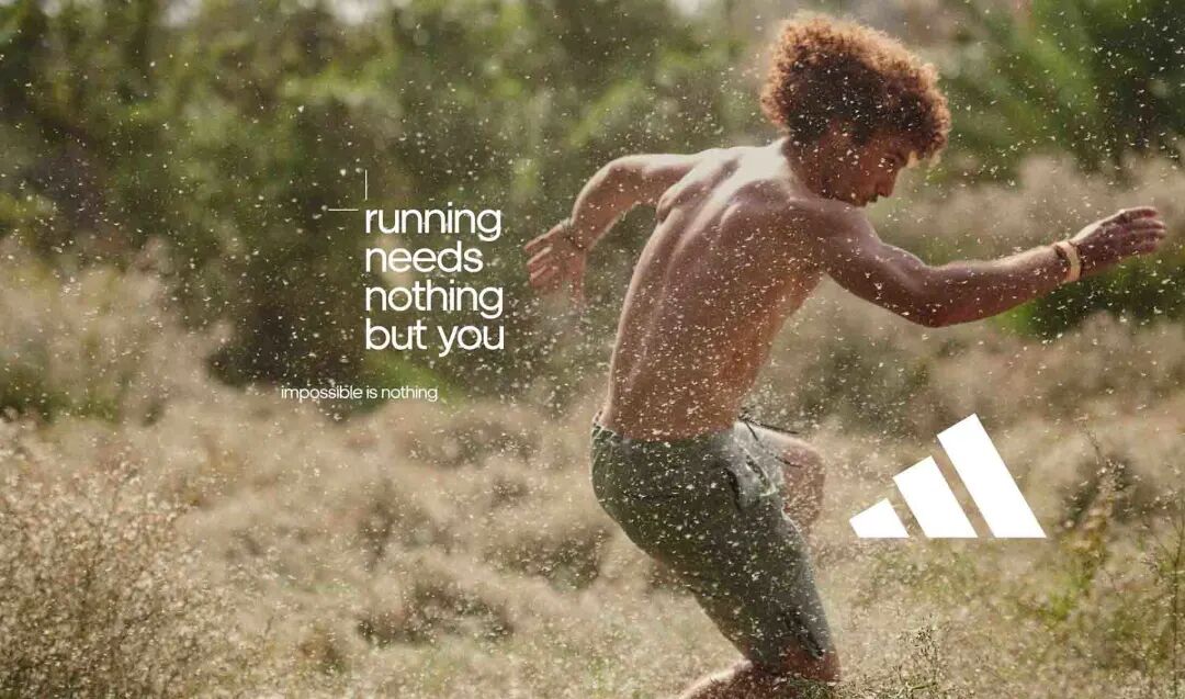 值得一提的是,去年Adidas 推出的一组跑步文案火了。主题是“running needs nothing but you”,翻译过来就是跑步无需其它。