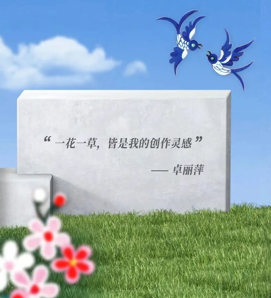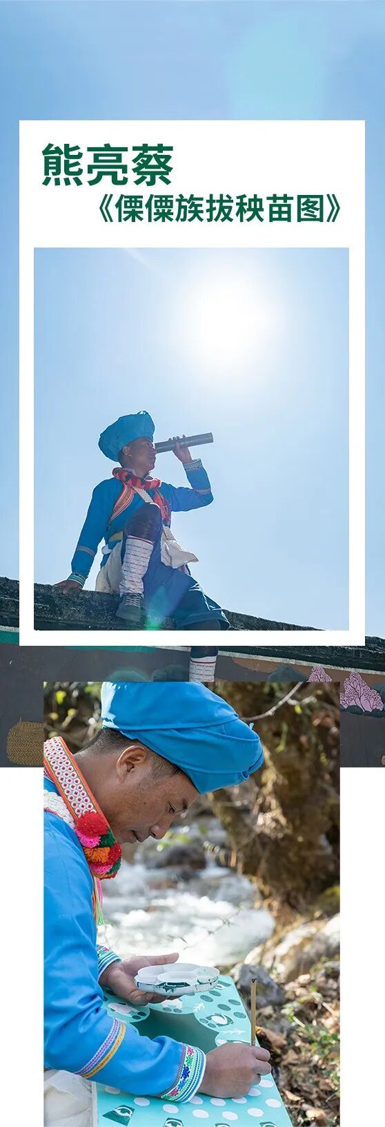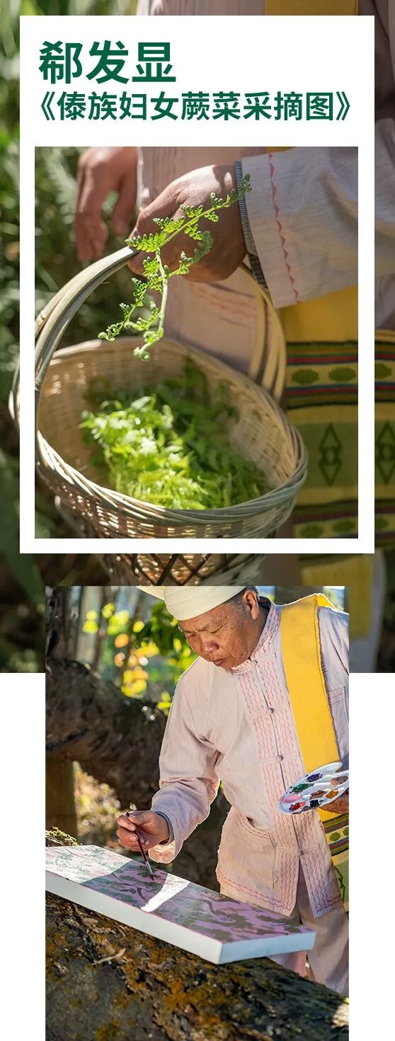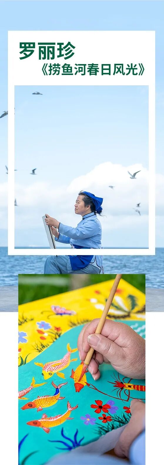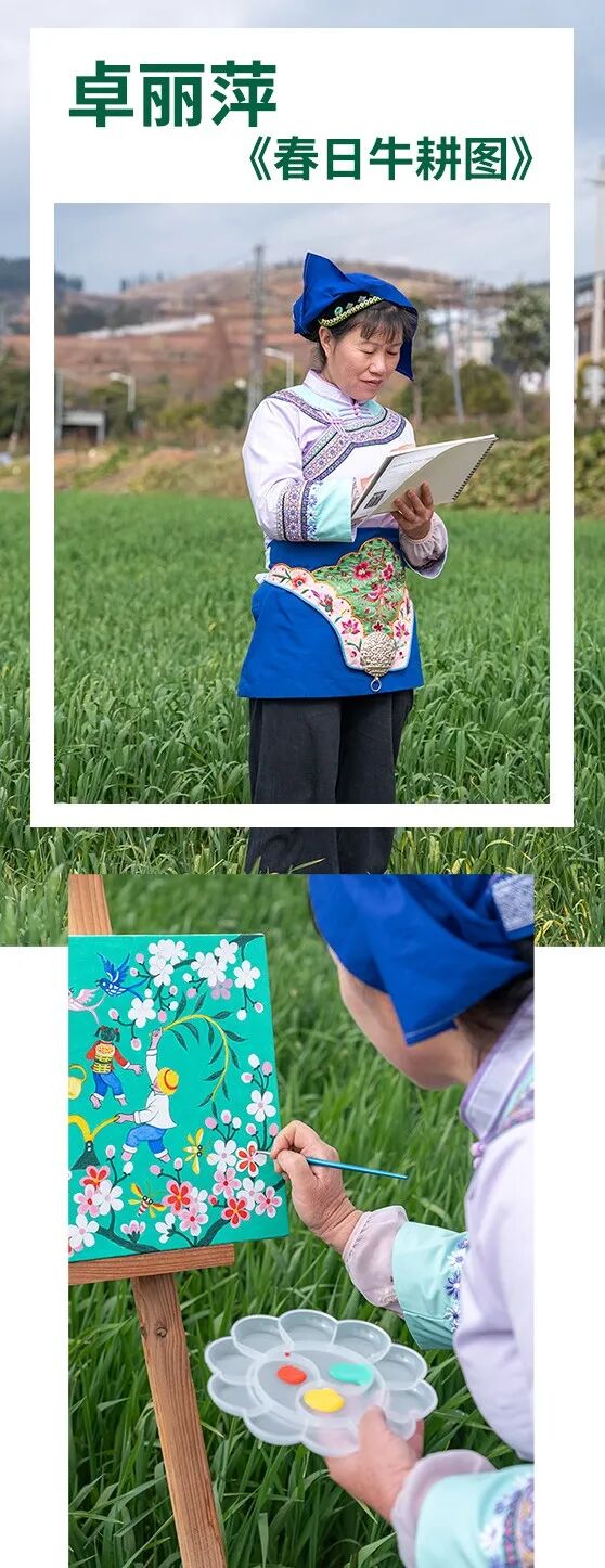 来自云南的农民画家“联名”。他们将自己眼中的鲜活春天描绘下来。在4个短视频中,生动地展示了农民画家创作的场景。作为云南美术家协会会员的卓丽萍,她获奖无数,已经画了20多年画,这次带来的是《春日农耕图》,构建出一家四口在梨园耕作的春日画面;对于她来说,对春天最深的印象,就是20多年前和家人共同春耕的场景。在盛开的梨花树下,构建了一幅最美春耕图。在滇池长大的罗丽珍,创作了一幅《捞鱼河春日时光》,展现滇池渔民的生活。滇池碧波荡漾,风光旖旎,鱼儿自由自在地游着。明艳的色彩、肆意盛开的波斯菊都传达出她所向往的生活态度;九条自由自在的金线鲃,寓意着长久的吉祥如意,年年有余。快七十岁的郗发显,带来了《傣族妇女蕨菜采摘图》,描绘了春天里傣族妇女结伴上山采摘蕨菜的景象。粉色作为主色调,向大家表达和传递春天的快乐与幸福。每到春天的时候,镇里的男女老少都会成群结队的到山里去挖采蕨菜,这是他们关于春天的集体记忆。傈僳族的熊亮蔡,则通过《傈僳族拔秧苗图》记录下村民们拔秧苗时的春日劳作场景。这幅《傈僳族拔秧苗图》中,熊亮蔡用俯视视角,展现了人们春日拔秧的热闹景象。鱼儿在水中自由遨游,与水稻融为一体,展现傈僳族人对自然的理解与热爱。