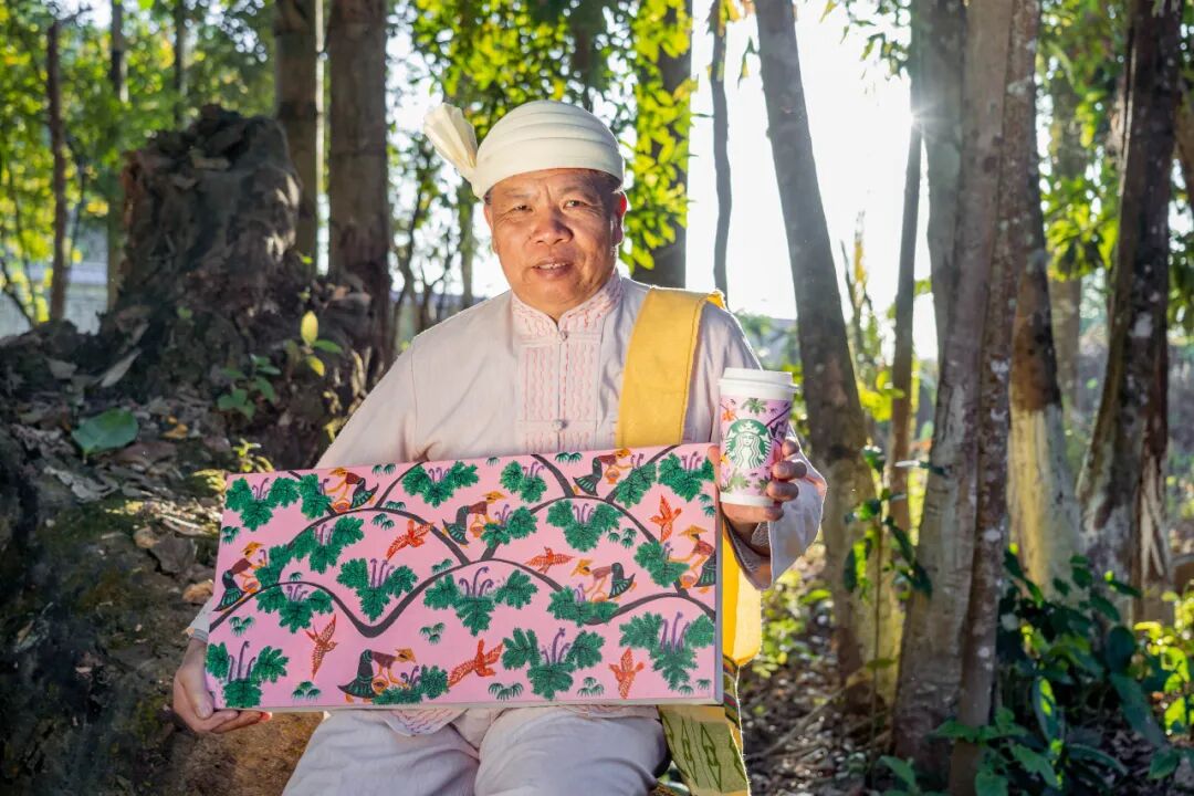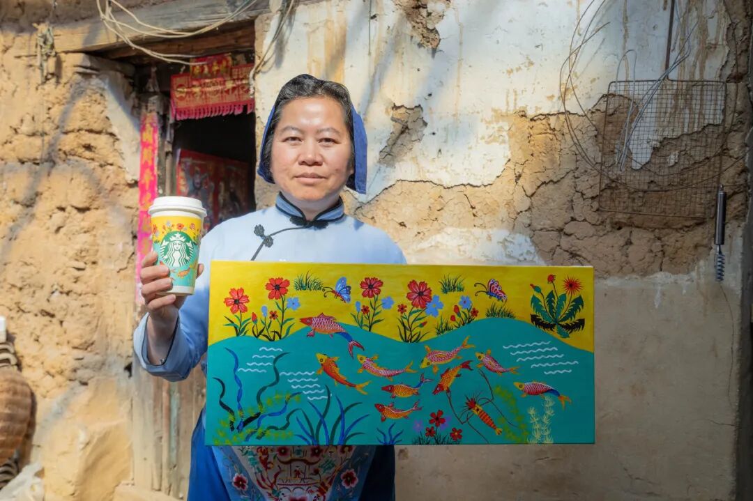 这些艺术作品,将在全国星巴克6000多家门店使用,消费者只要点购星巴克的任意大杯热饮,即可获得由四位农民画家所绘制的限定艺术纸杯。